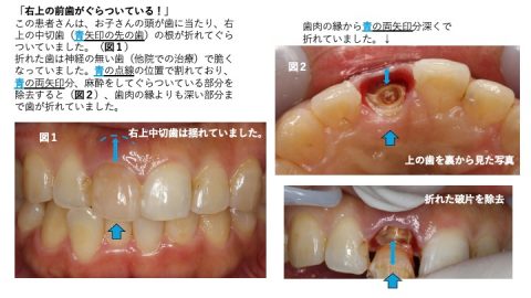 この患者さんは、お子さんの頭が歯に当たり、右上の中切歯(青矢印)の根が折れてぐらついていました。(図1)