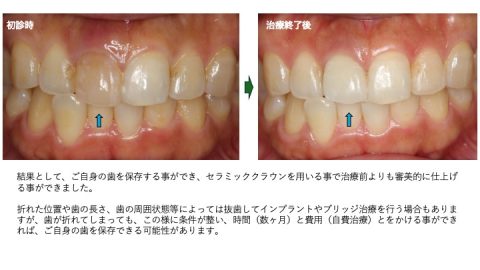 折れた位置や歯の長さ、歯の周囲状態等によっては抜歯してインプラントやブリッジ治療を行う場合もありますが、歯が折れてしまっても、この様に条件が整い、時間(数ヶ月)と費用(自費治療)とをかける事ができれば、ご自身の歯を保存できる可能性があります。