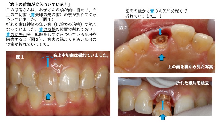 この患者さんは、お子さんの頭が歯に当たり、右上の中切歯(青矢印)の根が折れてぐらついていました。(図1)