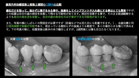 そのため当院では、「歯を抜かずにできるだけ残す」という言葉は、単に積極的な治療をせず様子を見ることではなく、「病状を改善させた上で歯を残すこと」であると考えています。
